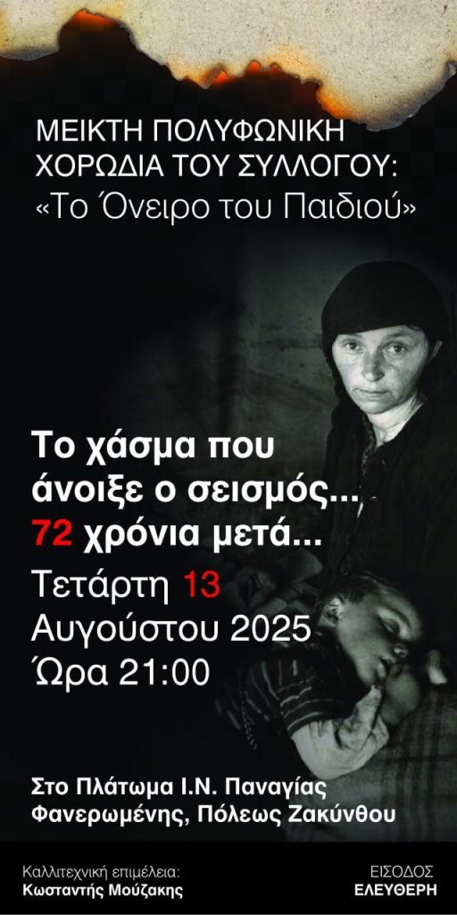 Η μεικτή πολυφωνική χορωδία του Συλλόγου “Το όνειρο του παιδιού” τιμά την θλιβερή επέτειο των σεισμών του 1953 με εκδήλωση που θα γίνει την Τετάρτη 13 Αυγούστου στις 9 το βράδυ στο πλάτωμα της εκκλησίας της Φανερωμένης στην πόλη της Ζακύνθου.